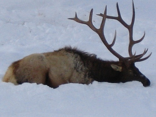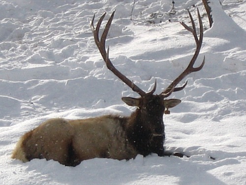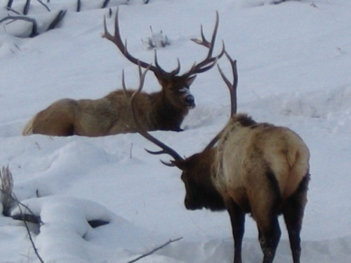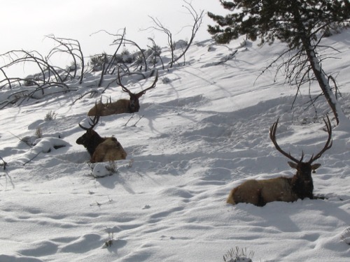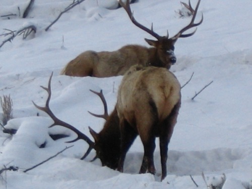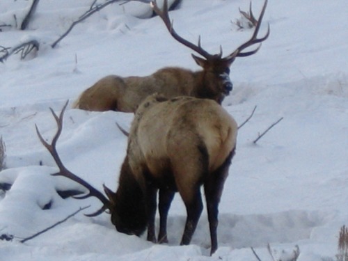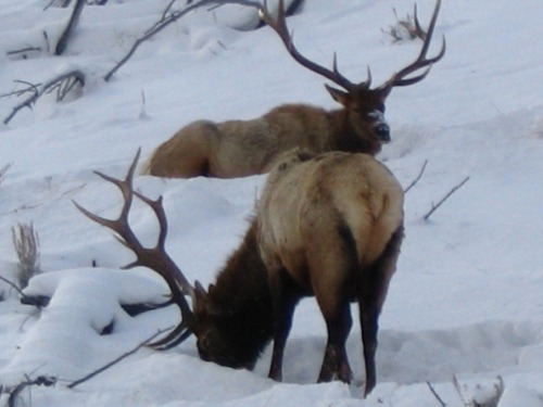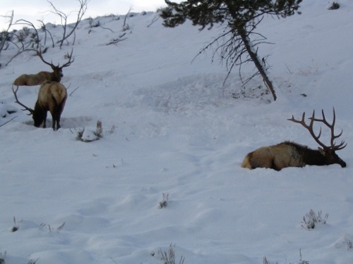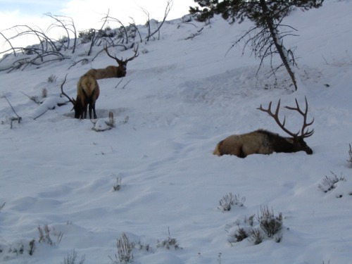 I left home about 9:00 AM and headed out into the park to view Yellowstone's Winter Wonderland. The day was cold, about 14 degrees with broken clouds. The road to Mammoth was snow covered, plowed and cindered. It was a nice drive with no traffic on the road. I knew there were a group of wolf watchers out in Little America or Lamar and I had hoped to join in the fun. Just as I drove past Blacktail Lakes, there were three bull elk just off the road waiting for me to take their pictures. They were great looking elk and it was nice to see them. There was very little traffic and I just took my time and admired the setting and winter scenery. There were two small herds of bison just past the Lava Creek area. I stopped and changed batteries on Carlene's new digital camera. It sure was nice of her to let me use it and to be able to have photos to add to the report.