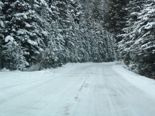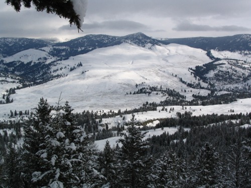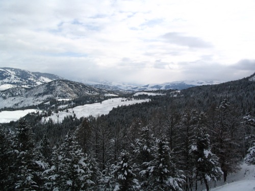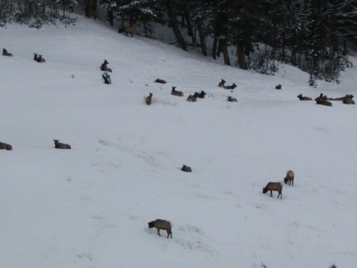 Just east of Phantom Lake there was a small herd of elk feeding and resting. They seemed to be making it through the winter okay. The snow was not too deep and they seem to be enjoying the day. As I headed east towards Hellroaring the wind picked up a little and storm clouds were setting in from the west. A few snow flurries came my way but nothing serious. I passed the Blacktail Drive entrance and Hellroaring. It was almost time for the noon meeting in the Map Room at the Mammoth Hot Springs Hotel, so I turned around and headed back. At the Hellroaring overlook I took a few photos of Parkadise in winter to share. As I drove up to the chapel in Mammoth, I noticed the resident elk herd feeding just west of the church and had to take a picture so folks would know that the elk are still in the park and doing well. If I were an elk, I think I would live in the same place.