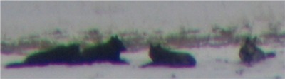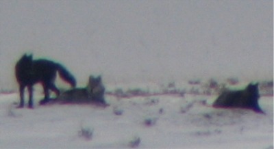 A couple from Canada stopped and joined in the viewing of the wolves. They got out their binocs and camera. We chatted and shared my scope and stories as we watched the Druids. This is the mating season for wolves and this was the first time I had seen them mate. We shall have some new pups this spring and it will be another interesting spring in Lamar Valley for watching wolves, wolf pups and bears along with all the other great wildlife in Yellowstone. I was able to take a few pictures through my spotting scope with Carlene's digital camera. It was fun to try and get them in view and focus while looking into the sun. They are not the best pictures by any means, but they are Druid Wolves and fun none the less. They were milling around and playing and mating. They were mostly playing and displaying mating behavior. Very interesting to watch and see the relationships in the pack. Not all that has been written on wolves in the text books is true about mating behavior. But, these wolves has just about disproved all wolf behavior books or theories. There was one dark gray, two light grays and four blacks in this pack. The alpha male is a very large black wolf.