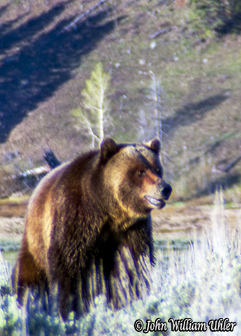28 degrees this morning warming up to a windy 58 degrees. The Trumpeter Swan flew by again this morning. At 5:30 a.m. I found a tall grizzly below Amethyst Bench. At 5:35 a.m. we had two smaller grizzlies on Amethyst Bench. Soon the large tall grizzly climbed the bench and joined the two - it was the two sows and one boar again. Later one sow did move away and near dark the now courting pair were in the old Druid Rendezvous area. At 7:15 a.m. we watched a large grizzly on Norris heading to the east. At 8:15 a.m. the grizzly sow and yearling were back again close to the road east of the Lamar River Bridge. Later they crossed the bridge and great viewing at 230 yards from Lamar Canyon West across the river. At 9:00 a.m. we had a courting pair of grizzlies high north of Slough Creek, good viewing for a long spot but they were in the snow. At 2:35 p.m. we watched a black sow with two brown cubs of the year east of Yellowstone Picnic - the cubs were sleeping in a tree. At 6:45 p.m. I found a large black bear digging in the tree line south and east of Trash Can. The now courting pair (one sow left) were in the old Druid Rendezvous area. At 7:40 p.m. I spotted a brown grizzly near the new growth forest south and west of Footbridge Pullout.